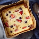 Pour the creamy batter into the prepared baking dish and smooth out the top with a spatula. If you’ve chosen to include berries, scatter them evenly across the surface now—they infuse the dessert with juicy pops of freshness and a gorgeous splash of color. Slide your dish into the oven and bake for 40 to 45 minutes. You’re looking for a center that’s set without wobbling and a lightly golden top that signals perfection.
