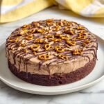 - Assemble and Garnish: Drizzle the ganache in a spiral pattern over the peanut butter layer. Immediately sprinkle the chopped pretzels and cocoa nibs across the top, finishing with a dusting of flaky sea salt for an added texture and flavor burst.
