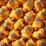 In a small saucepan, combine butter, brown sugar, 1 tablespoon of Dijon mustard, Worcestershire sauce, and poppy seeds. Bring this mixture to a gentle boil so the sugar dissolves and flavors meld into a glossy, irresistible glaze. Once ready, pour the warm glaze evenly over the uncooked pigs in a blanket, making sure every piece will get that signature shine.