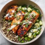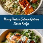 These vibrant Honey Harissa Salmon Quinoa Bowls combine tender, spicy-sweet roasted salmon with fluffy quinoa and fresh vegetables for a nutritious and flavorful meal. The harissa and honey marinade gives the salmon a perfect balance of heat and sweetness, while the fresh cucumber, tomatoes, red onion, and optional feta and hummus create a refreshing and satisfying bowl. Ideal for a healthy weeknight dinner, this recipe is easy to prepare and packed with wholesome ingredients.