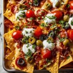Distribute spoonfuls of marinara sauce over the pasta chips, then sprinkle the mozzarella and Parmesan cheeses generously over the top. Add pepperoni slices and, if you’re including them, black olive slices for that popping contrast. The layering prepares the Italian Nachos Recipe for its final, melty transformation in the oven.