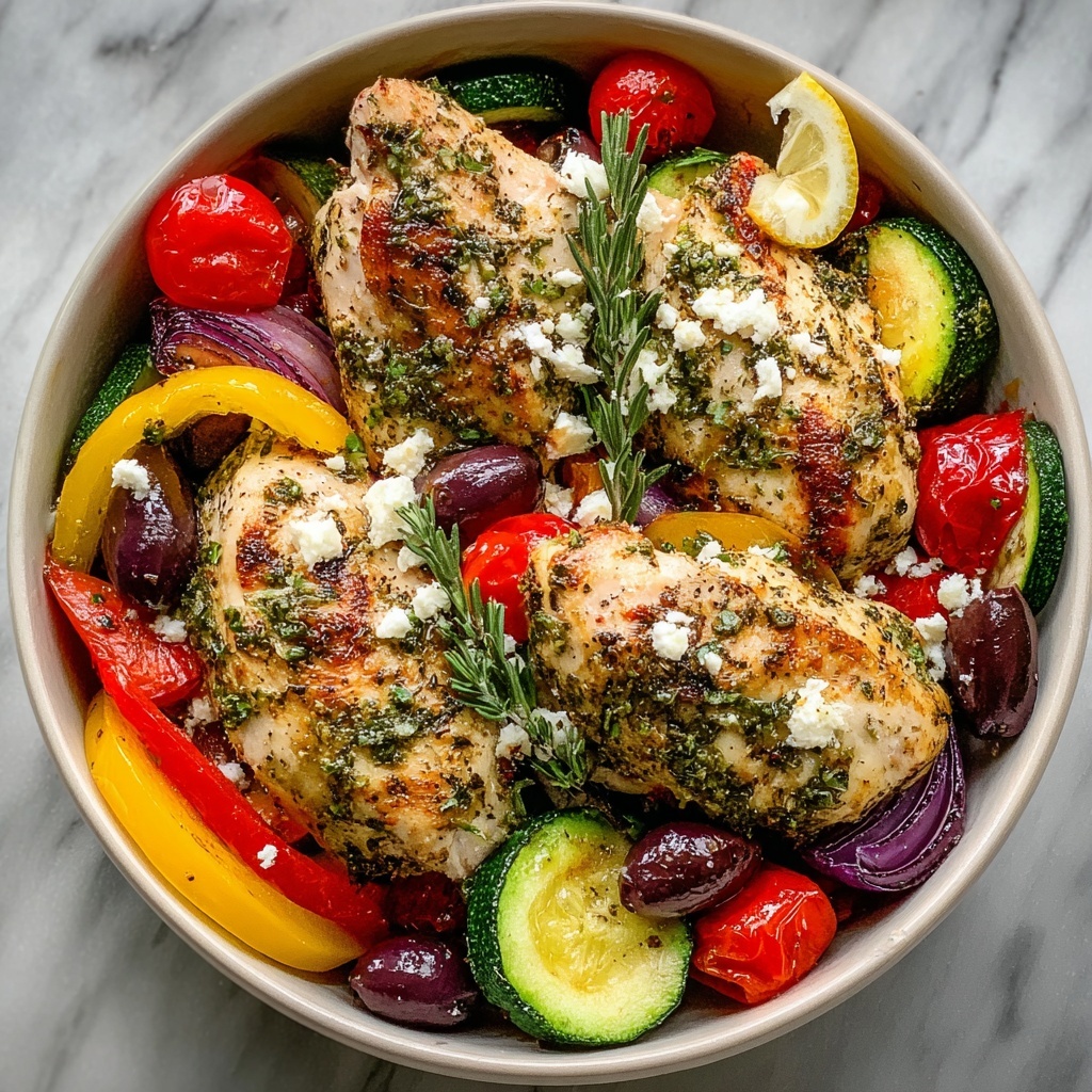 A flavorful and healthy Mediterranean Chicken Zucchini Bake featuring tender chicken breasts marinated with herbs, roasted alongside vibrant zucchinis, bell peppers, onions, cherry tomatoes, and Kalamata olives, finished with crumbled feta cheese and served with fresh lemon wedges.