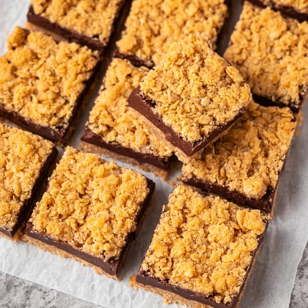 In a large bowl, cream together the softened butter and brown sugar until it’s light and fluffy—this ensures your bars have that tender, melt-in-your-mouth quality. Next, beat in the eggs and a tablespoon of vanilla extract for warmth and depth. In a separate bowl, whisk together oats, flour, baking soda, and salt, then gradually stir these dry ingredients into the butter mixture. This layered mixing ensures your dough is just right: chewy with a subtle rise and balanced flavors.