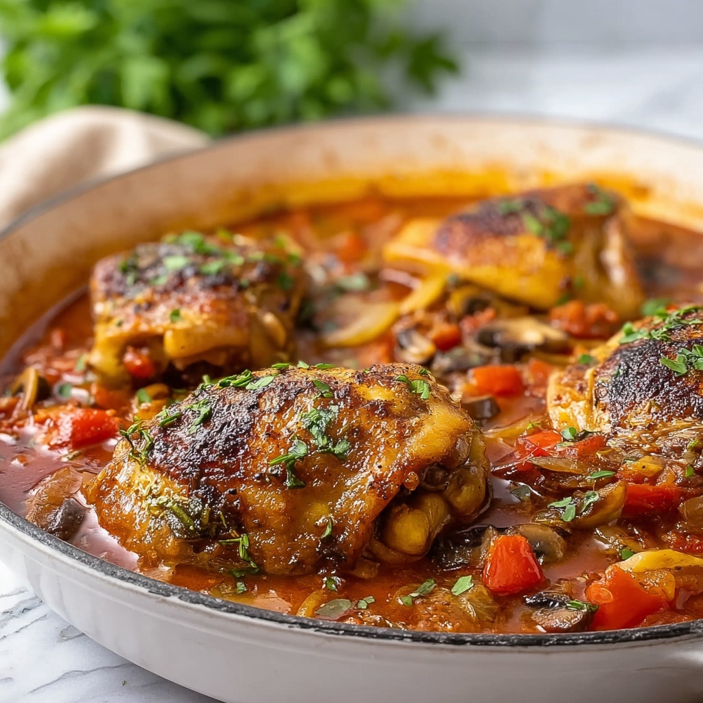 A flavorful and easy one-pan Chicken Cacciatore recipe featuring tender chicken thighs simmered with bell peppers, tomatoes, and Italian seasoning for a comforting Italian-inspired meal.