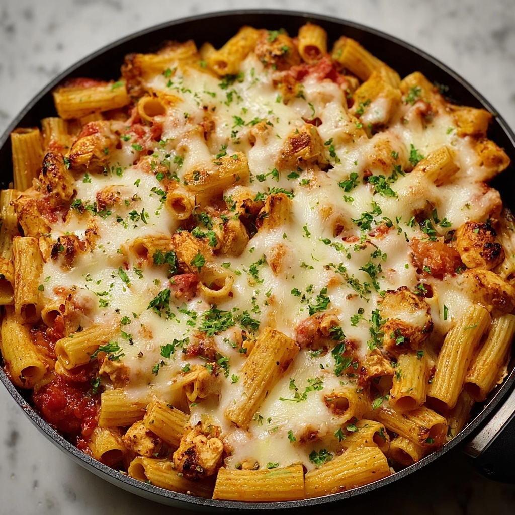 Once your pasta is perfectly tender and your chicken is cooked through, it’s time for the final touch. Sprinkle shredded mozzarella and grated Parmesan cheese evenly over the top of the pasta. Cover your skillet with a lid to trap the heat and cook for 2 to 3 minutes until the cheeses melt into a gooey, bubbly layer that makes this dish truly irresistible.