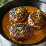 A sprinkle of freshly chopped parsley adds a pop of green freshness and a mild herby note that brightens the rich gravy. You might also try a few crisp fried onions for contrast in texture that complements the tender patties perfectly.