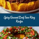 This Spicy Ground Beef Taco Ring is a delicious and visually appealing dish perfect for parties or family dinners. Ground beef is seasoned with taco spices, cooked with onion and garlic, then layered on crescent roll dough with melted cheddar and Monterey Jack cheeses. Baked until golden, this taco ring is garnished with fresh tomatoes, olives, and cilantro, served with sour cream and salsa for a flavorful Mexican-American main course or appetizer.